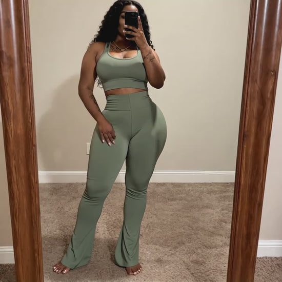Trendy women's casual outfit featuring a stylish strap crop top paired with high-waist flare pants. Perfect for casual outings, summer days, and comfortable everyday wear.